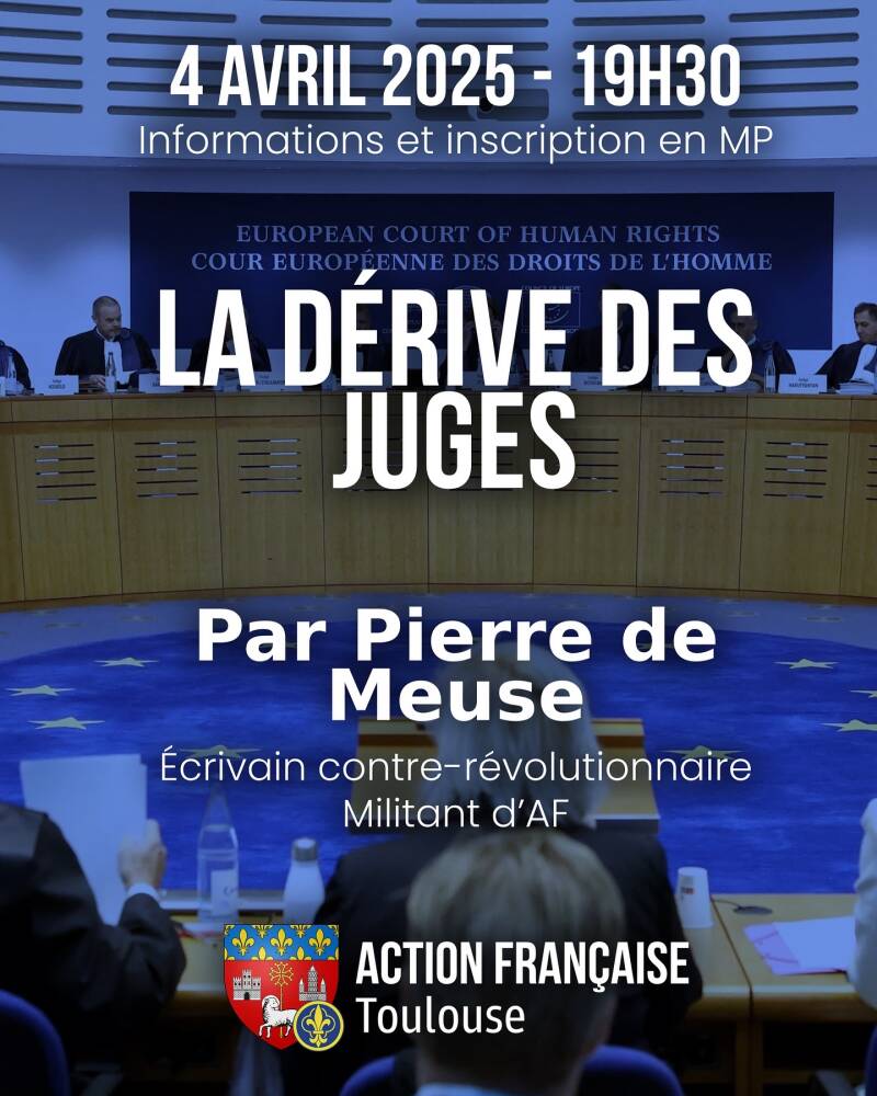 La prochaine conférence sur le thème de La dérive des juges organisée par l'Action Française aura lieu vendredi prochain 4 avril à 19h30. Elle sera donnée par Pierre de Meuse, écrivain contre-révolutionnaire et militant d'Action Française. Inscriptions en MP sur leur compte Instagram : https://www.instagram.com/actionfrancaise_toulouse/